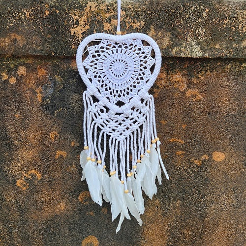 Heart shape dream catcher with crochet strings and ring crochet web catcher with cotton macramé goose feather strands