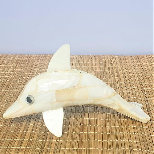 Lovely little swimming dolphin made with individually cut pieces of mother of pearl. It is a truly beautiful piece with the shine from the mother of pearl shell.