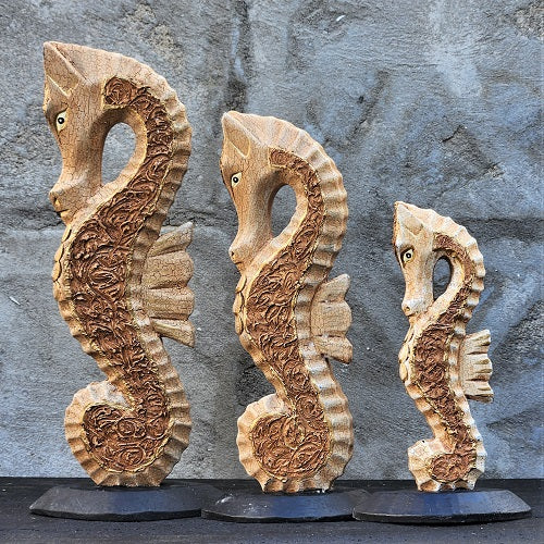 Set of 3 seahorses on stands in antique white crackle finish. Gold resin detail.